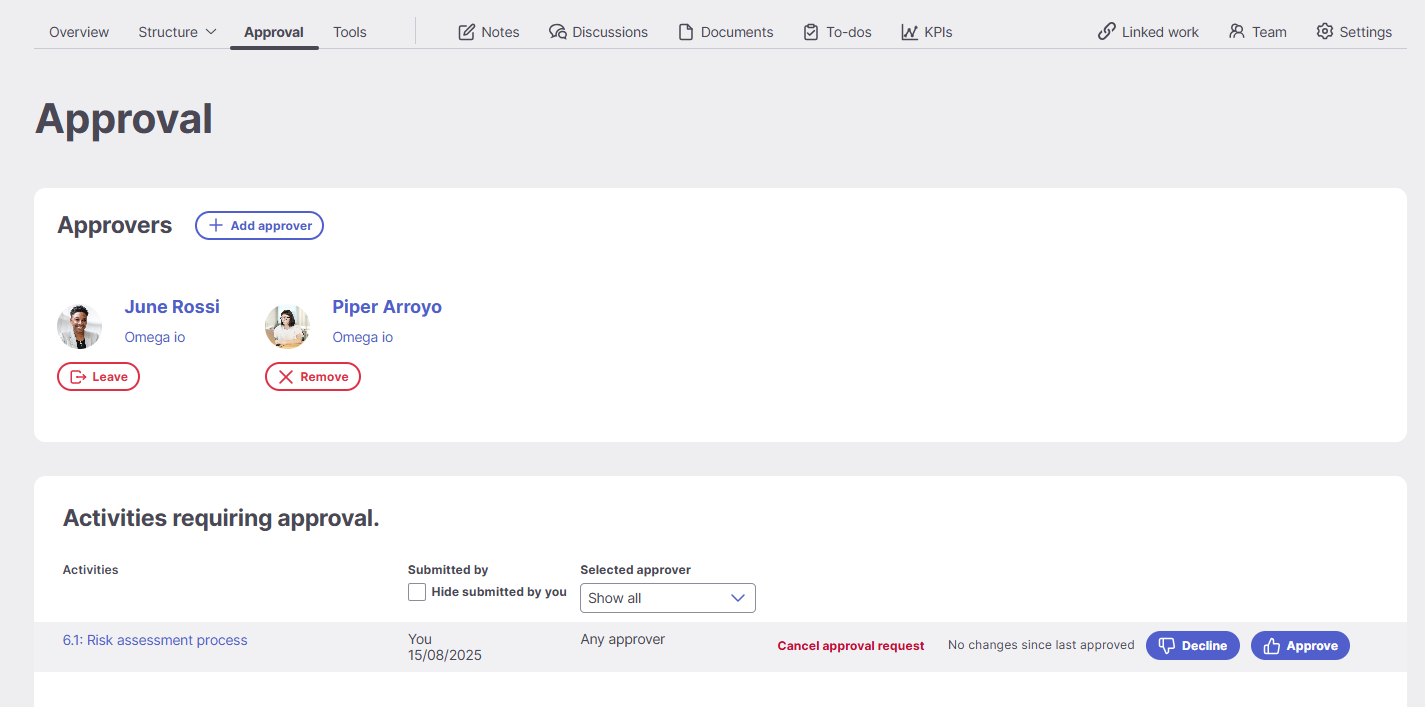 Only users with approval rights can approve or decline Activities.