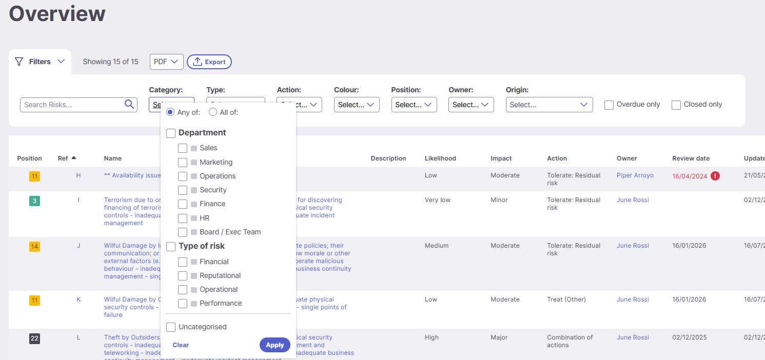 This makes it easy to focus on specific areas, such as risks by department or priority level.