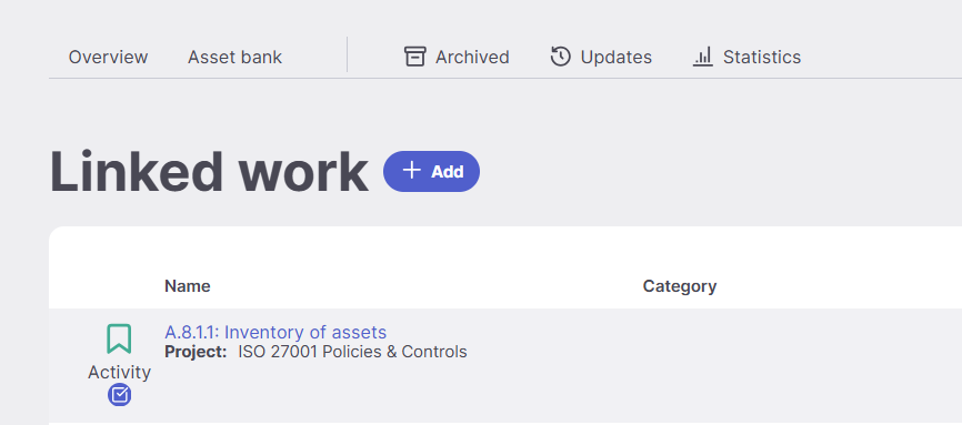 Linked Work is available in Projects, Activities, Tracks, Track Items, Accounts, Contacts, Contracts, Risks, and Groups. It allows you to link an area of ISMS.online to an existing work area, or create a new one and link them together automatically — provided you are a team member of both.