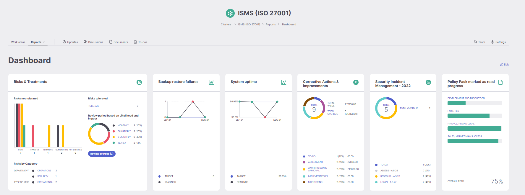 The Cluster Dashboard gives you a clear, real-time view of how your ISMS is performing. By bringing together the current status of your Tracks, Risk Registers, KPIs, and Policy Packs, it helps you see at a glance how you’re progressing towards your information security objectives. This overview not only supports day-to-day decision making but also makes it easy to prepare for management reviews by bringing the information you need into one place.