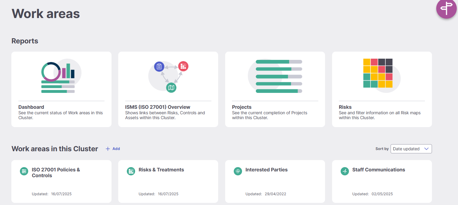 - Hover over Work in the ISMS.online action bar and click Clusters.