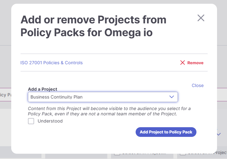 - Content from added Projects will be visible to your Policy Pack audience, even if they’re not team members in the original Project.